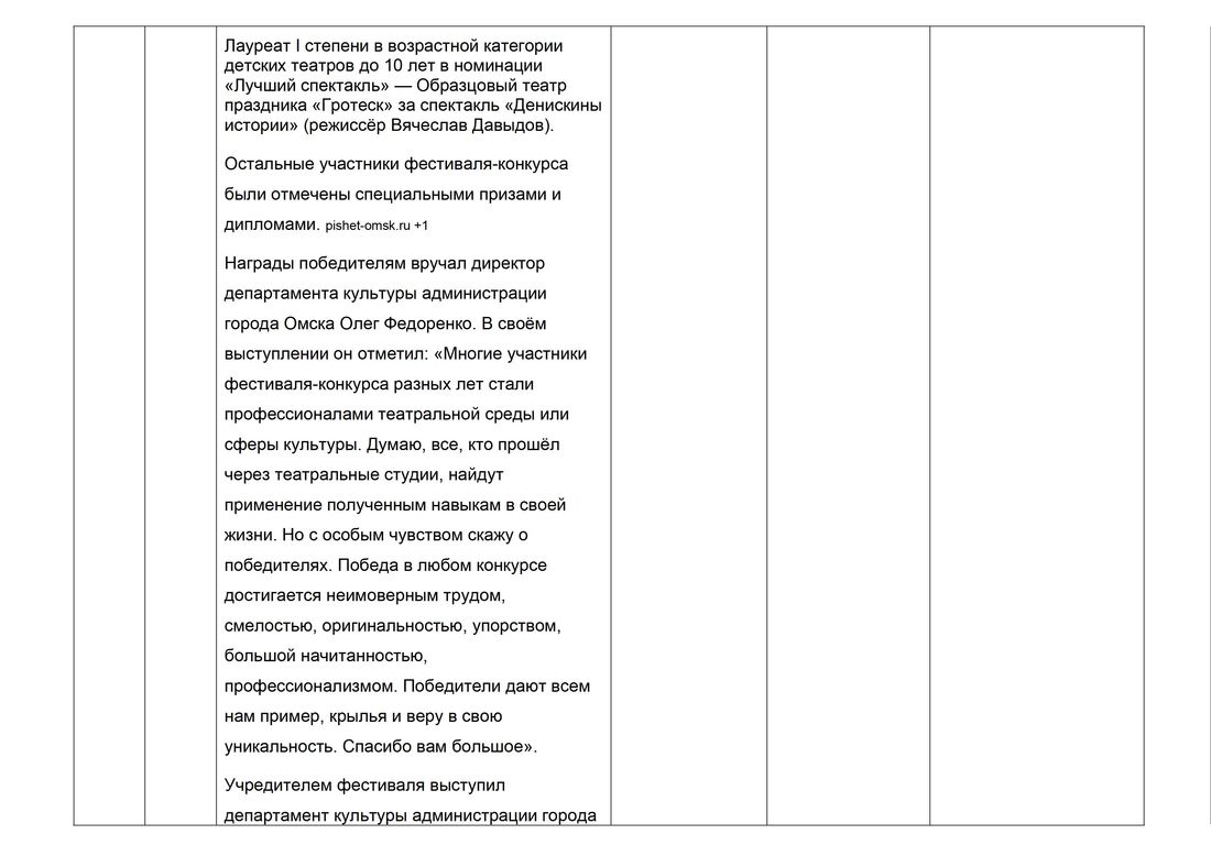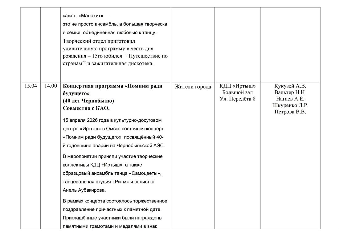 21.05 | 14.00 | Мероприятие по патриотическому воспитанию «Мир без войны» Мероприятие по патриотическому воспитанию «Мир без войны», основанное на памяти о детях войны и переданное через искусство цирковой и пластической драматургии, имеет исключительную культурную и патриотическую значимость. Уникальность театрализованного мероприятия заключается в сочетании современных технологий и традиционных форм искусства для передачи исторической памяти поколений. В программе используются элементы циркового искусства и 3D графики образцовой детской цирковой студии «Ликодемия», что позволяет зрителям глубже погрузиться в события Великой Отечественной войны. Этот подход делает историю доступной для современной молодежи, воспитывая патриотизм через искусство, акцентирует внимание на роли юных героев, что особенно важно для школьной аудитории, подчеркивая, что героизм и мужество не имеет возраста. Мероприятие «Мир без войны» актуально, интересно потому, что формирует у подрастающего поколения традиционные духовно-нравственные ценности, любовь к Родине в современном сложном и быстро меняющемся мире. | Учащиеся школЖители города | КДЦ «Иртыш» Большой зал Ул. Перелёта 8 | Очкурова А.А. Вальтер Н.Н. Кукузей А.В. Нагаев А.Е. Шкуренко Л.Р. Петрова В.В. | |